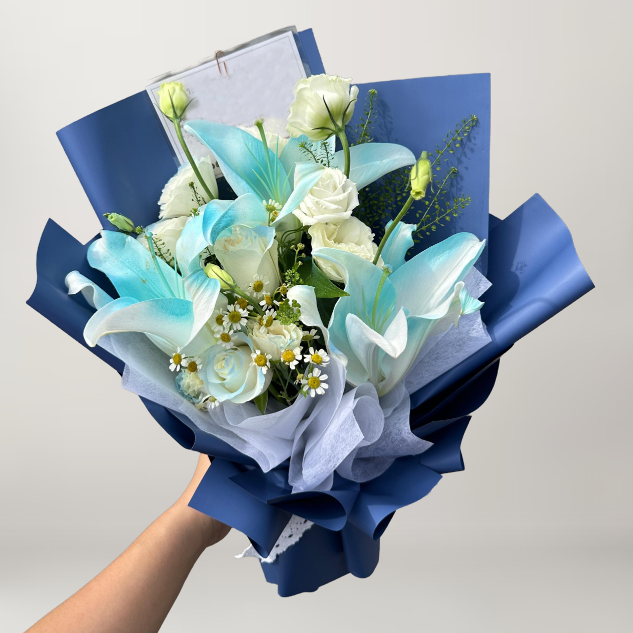 White Lilies ( Sprayed Light Blue )+ White Roses + Chamomile + White Eustoma + Eucalyptus Leafs
