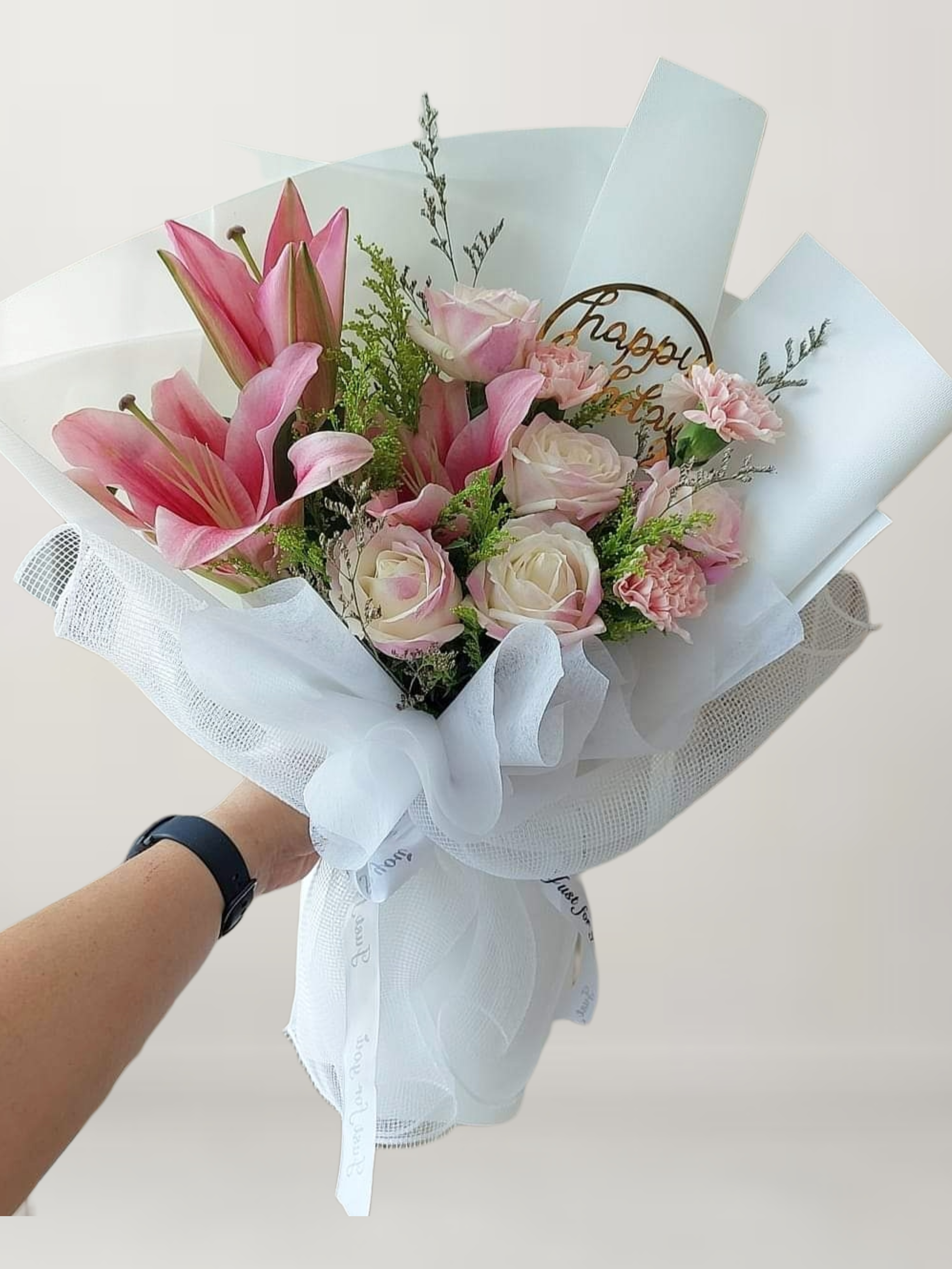 White Roses ( Sprayed Pink ) + Pink Lily + Yellow Peacock + Pink Carnation