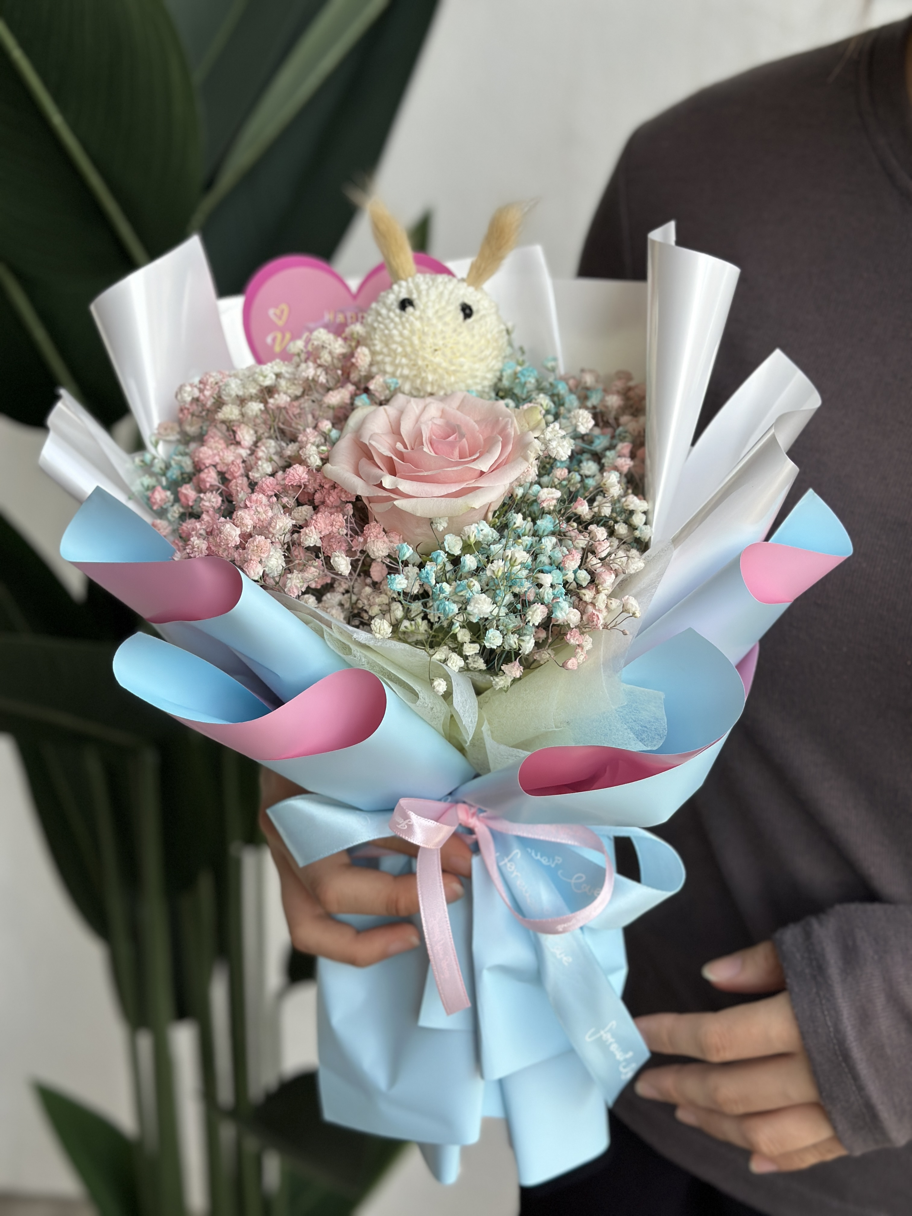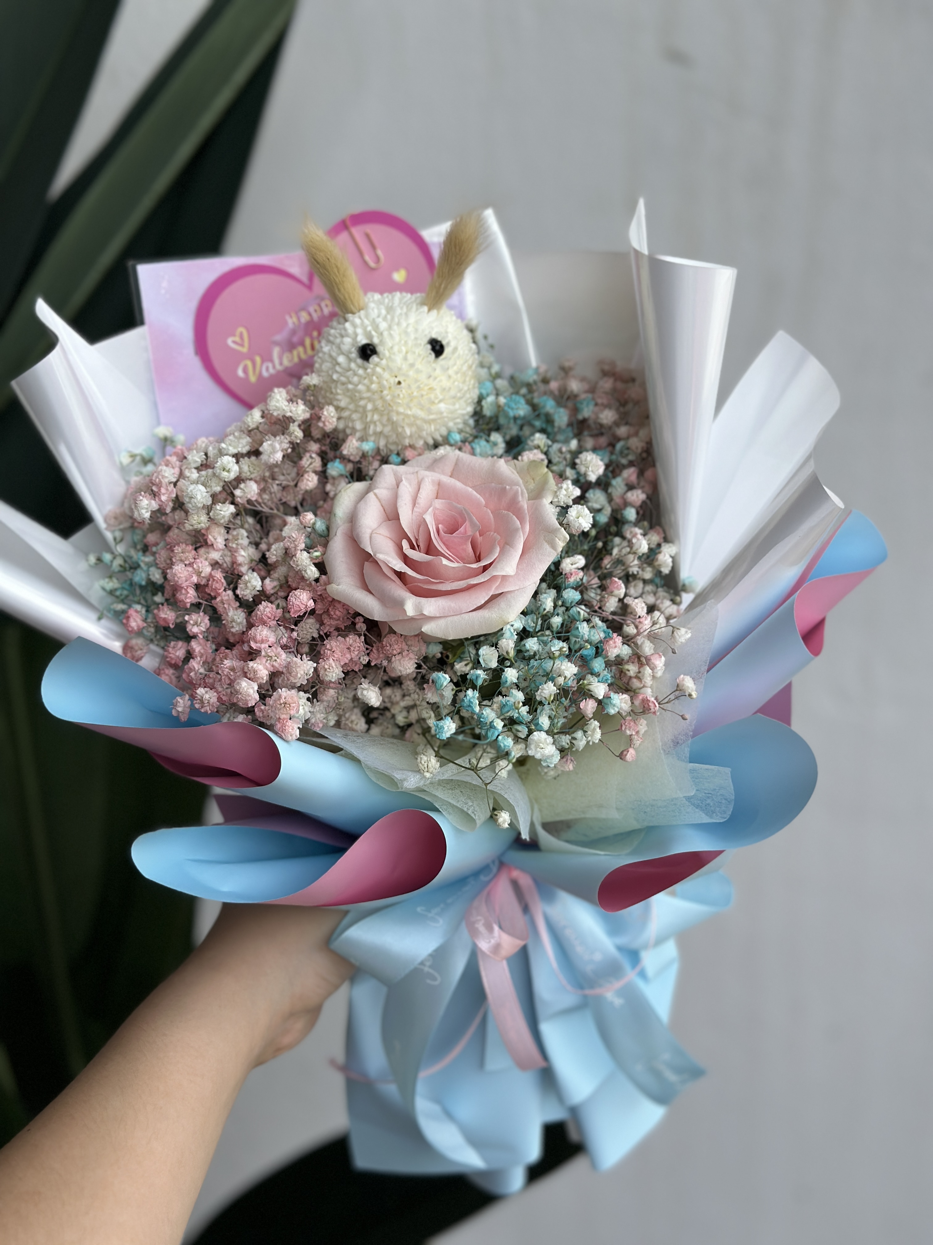 Single Rose + Babybreath ( Sprayed Color ) + Bunny ( Made with Ping Pong flower )