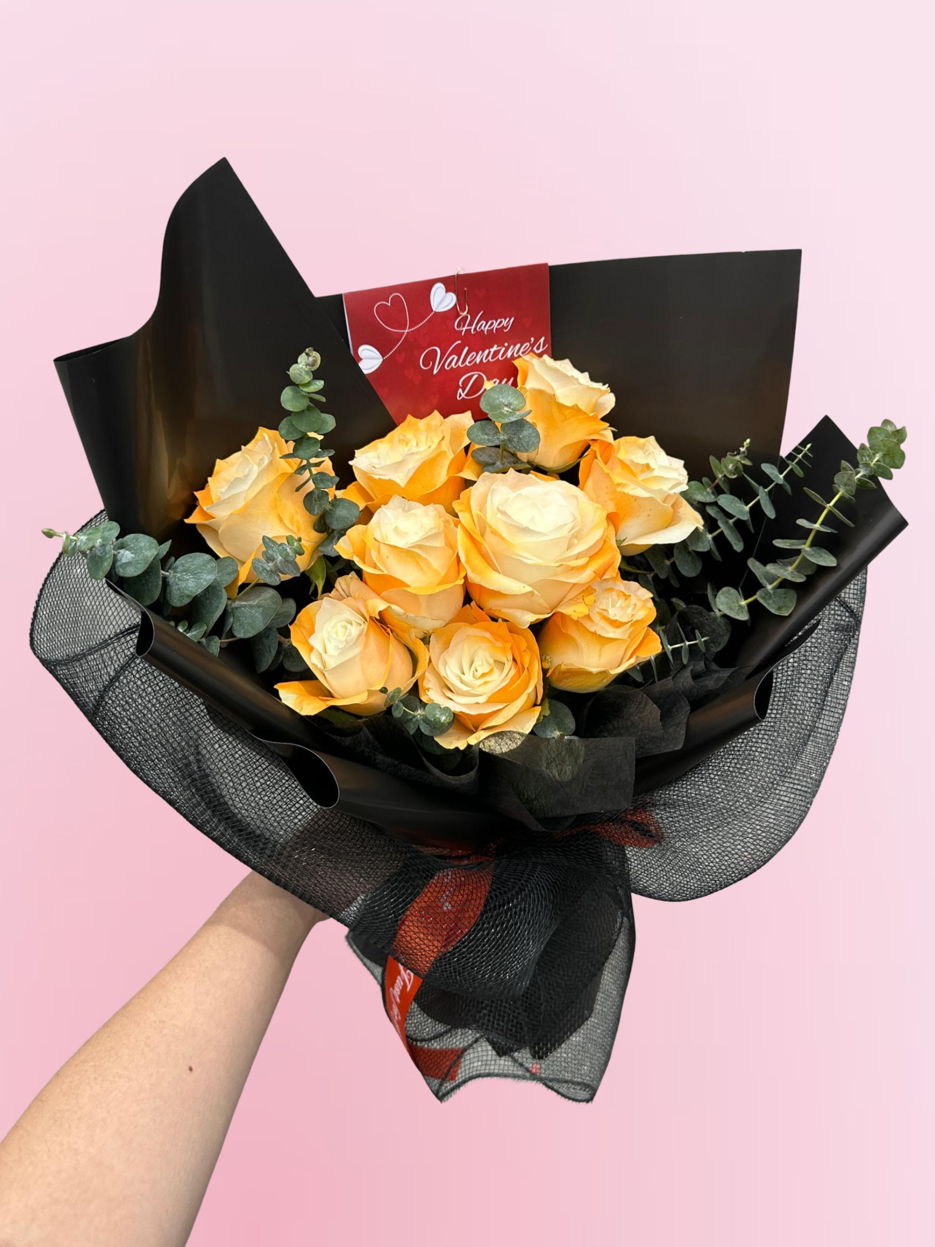 9 pcs white roses sprayed to orange arranged with eucalyptus leafs.