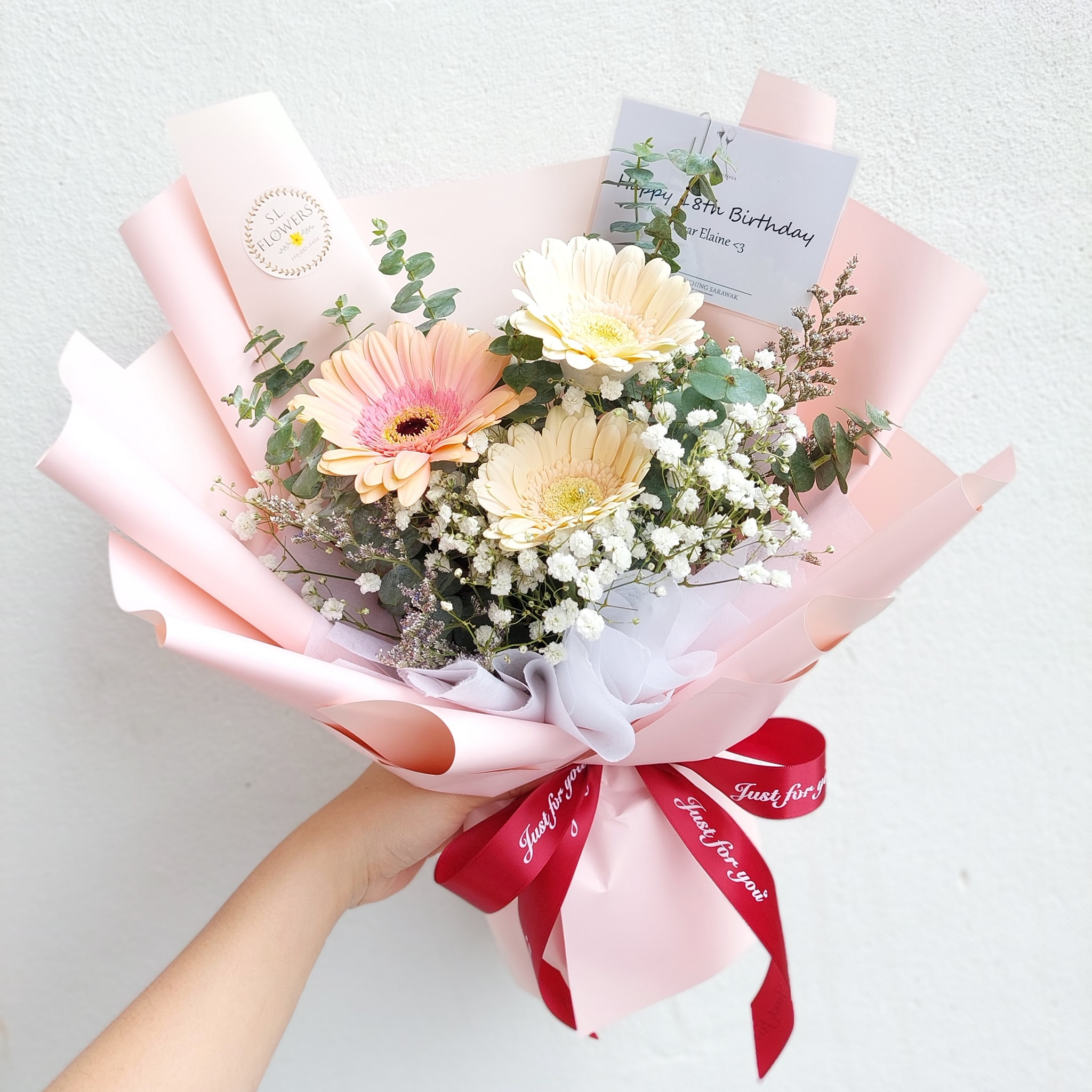 3 Gerbera +babybreath + eucalyptus leafs